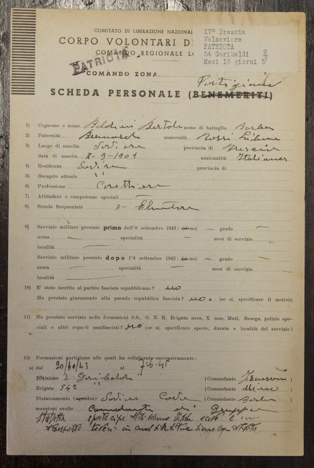 BOLDINI BORTOLO - Partigiano e Patriota