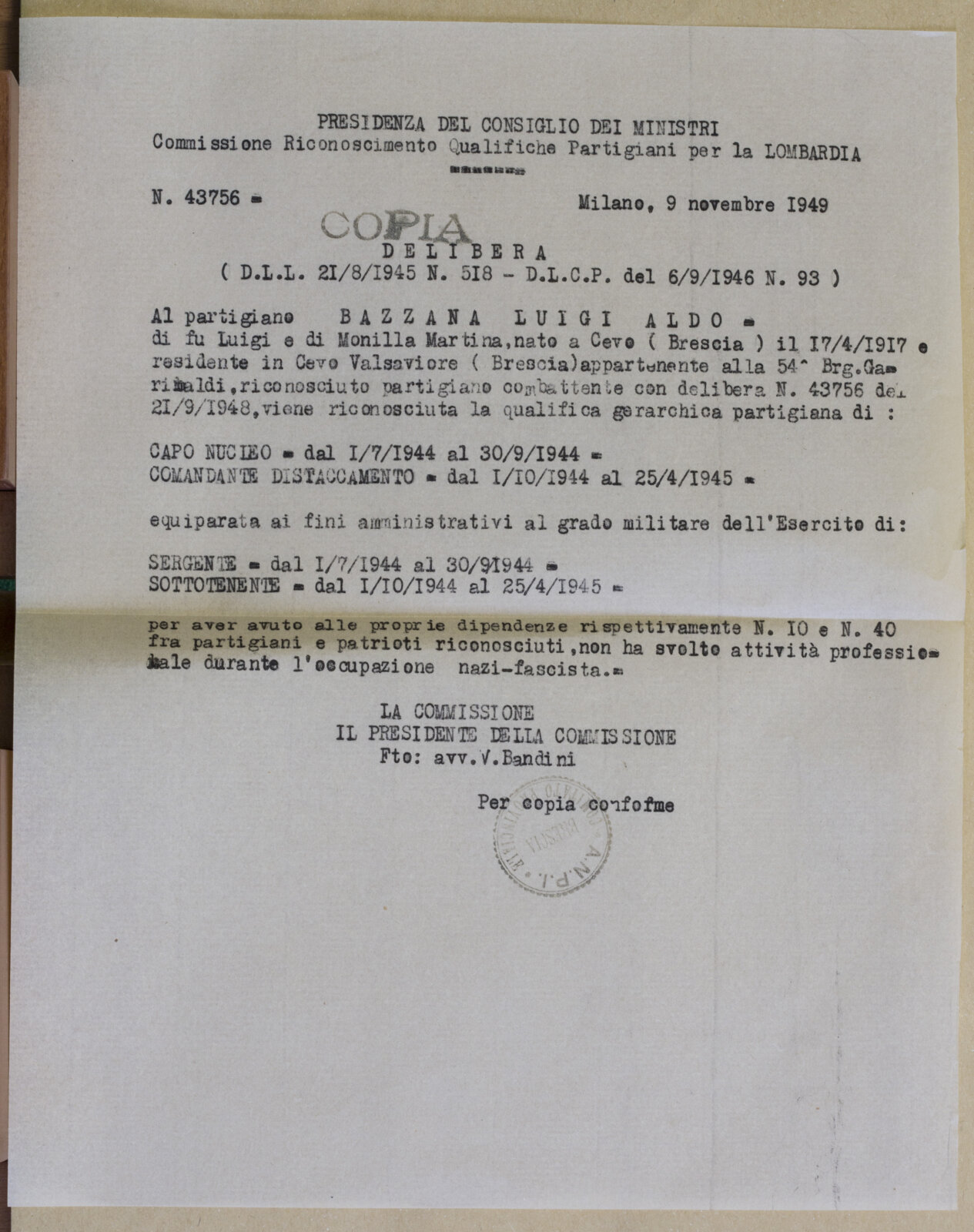BAZZANA LUIGI ALDO - Partigiano e Sottotenente