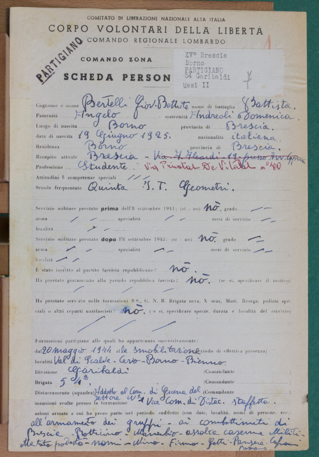 BERTELLI GIOVAN BATTISTA - Partigiano