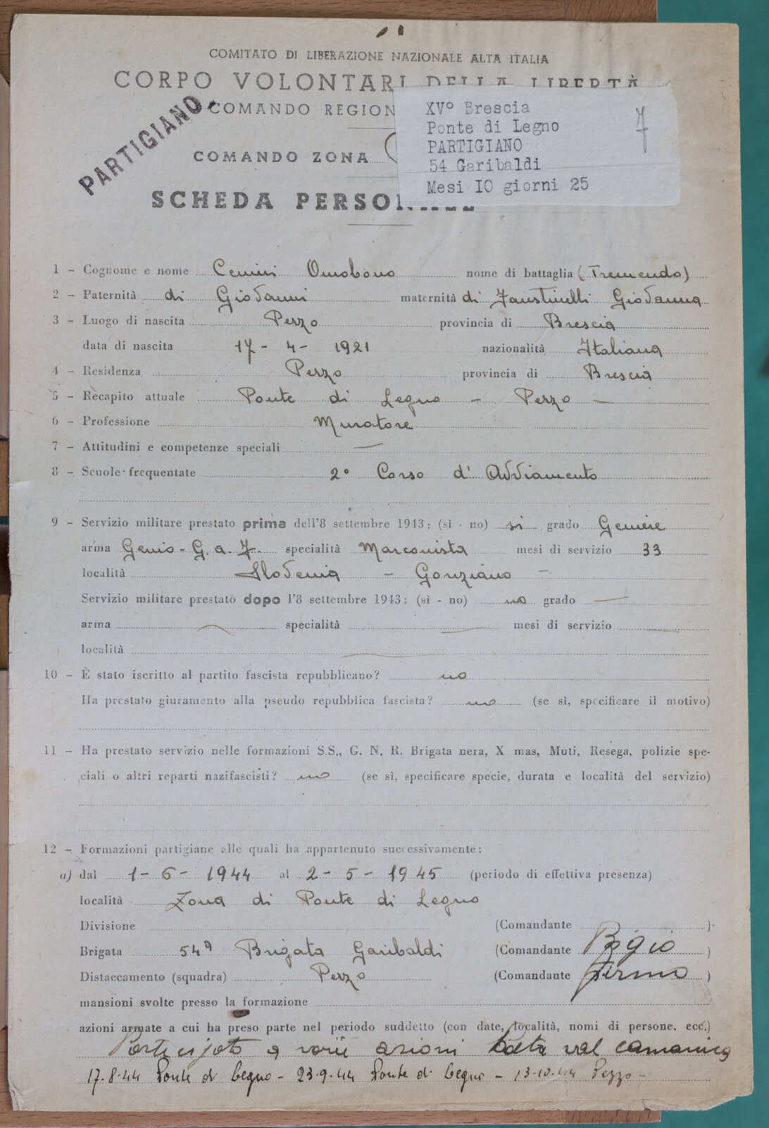CENINI OMOBONO - Partigiano