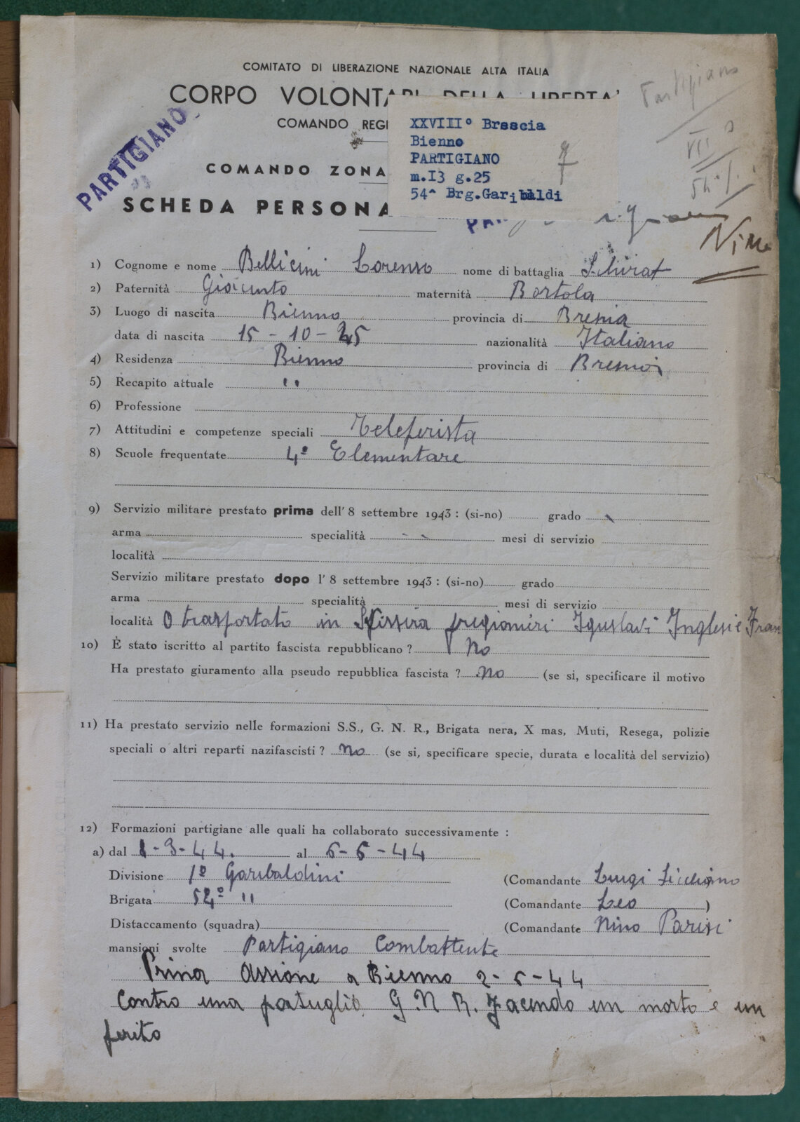 BELLICINI LORENZO - Partigiano