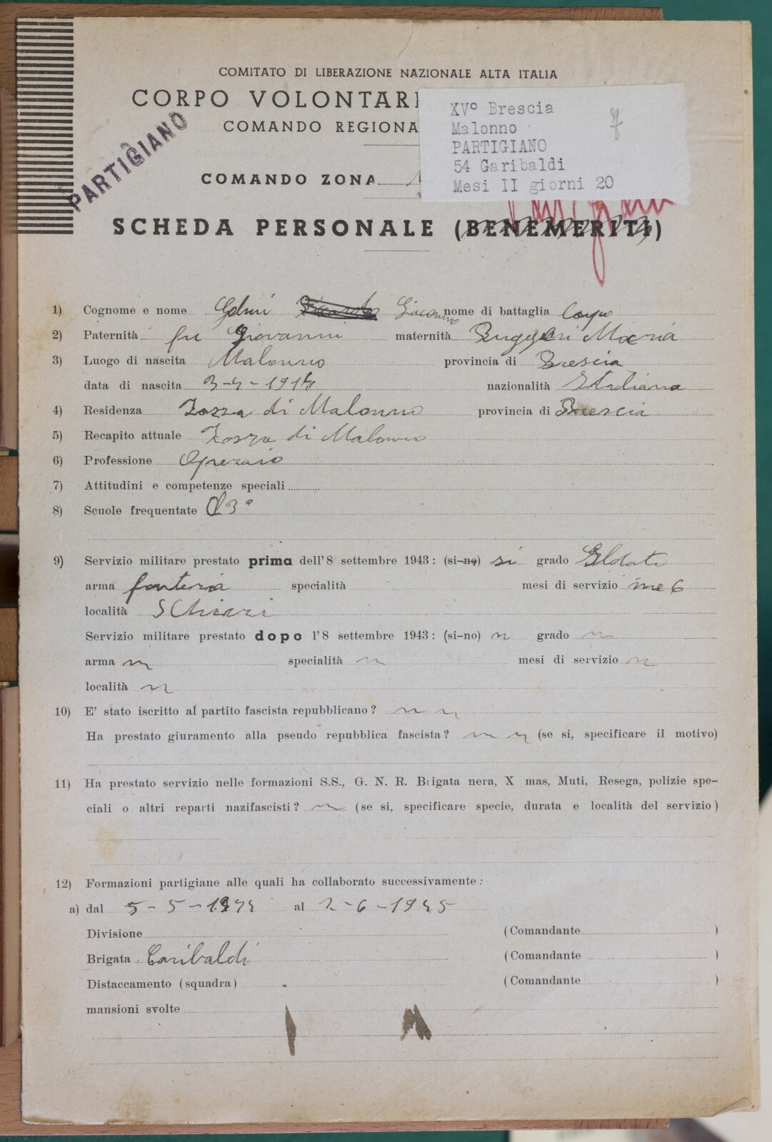 GELMI GIACOMO (04-04-1914) - Partigiano