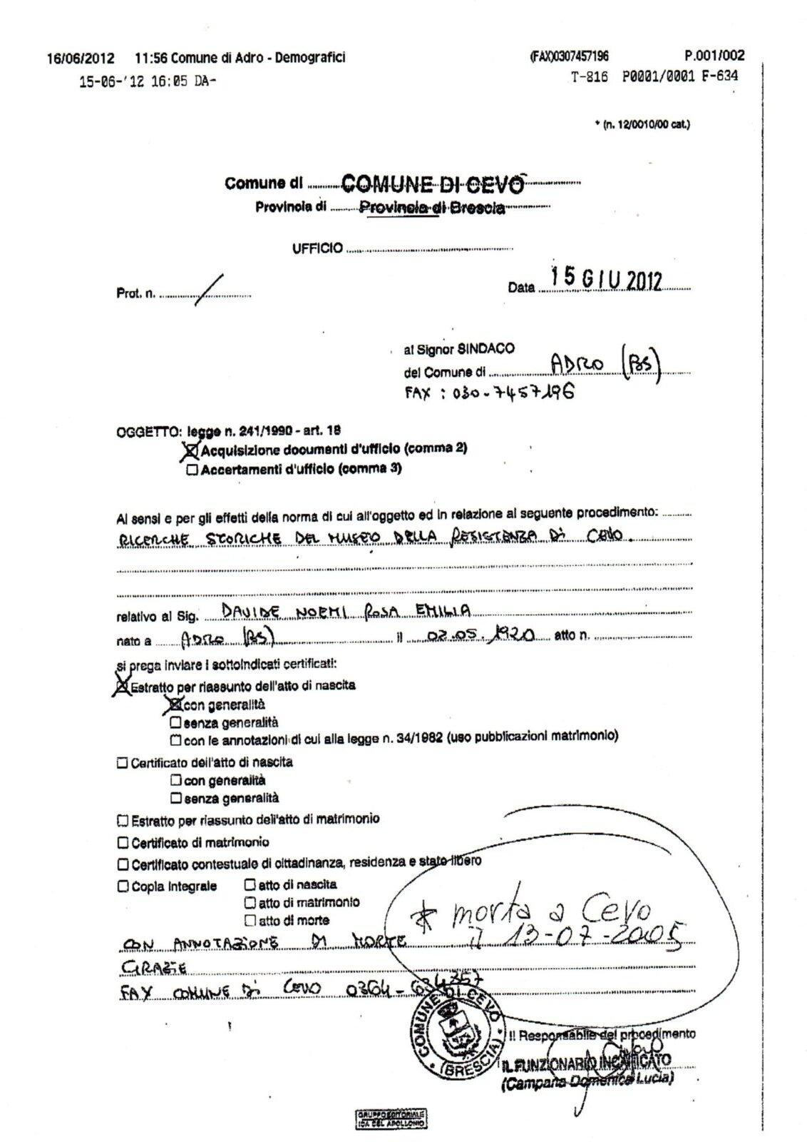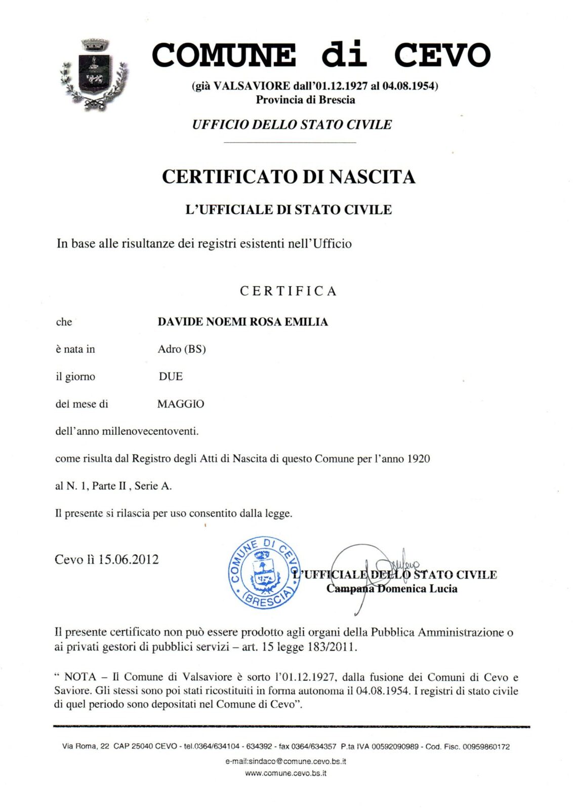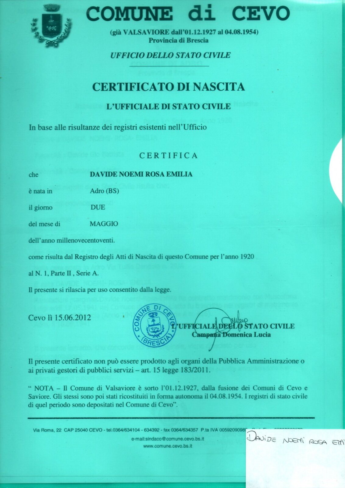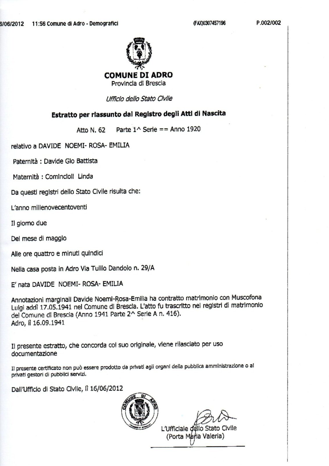 DAVIDE EMILIA NOEMI ( MILIA DEL DOS)- TESTIMONI