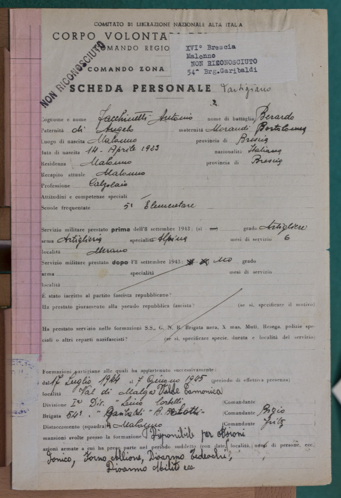 FACCHINETTI ANTONIO - Partigiano non riconosciuto