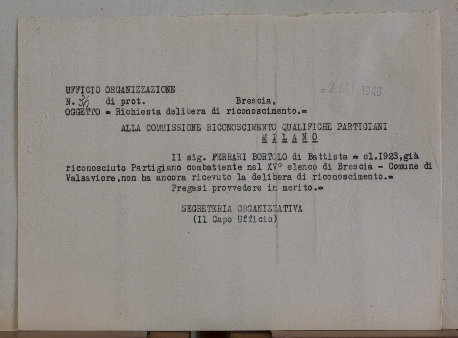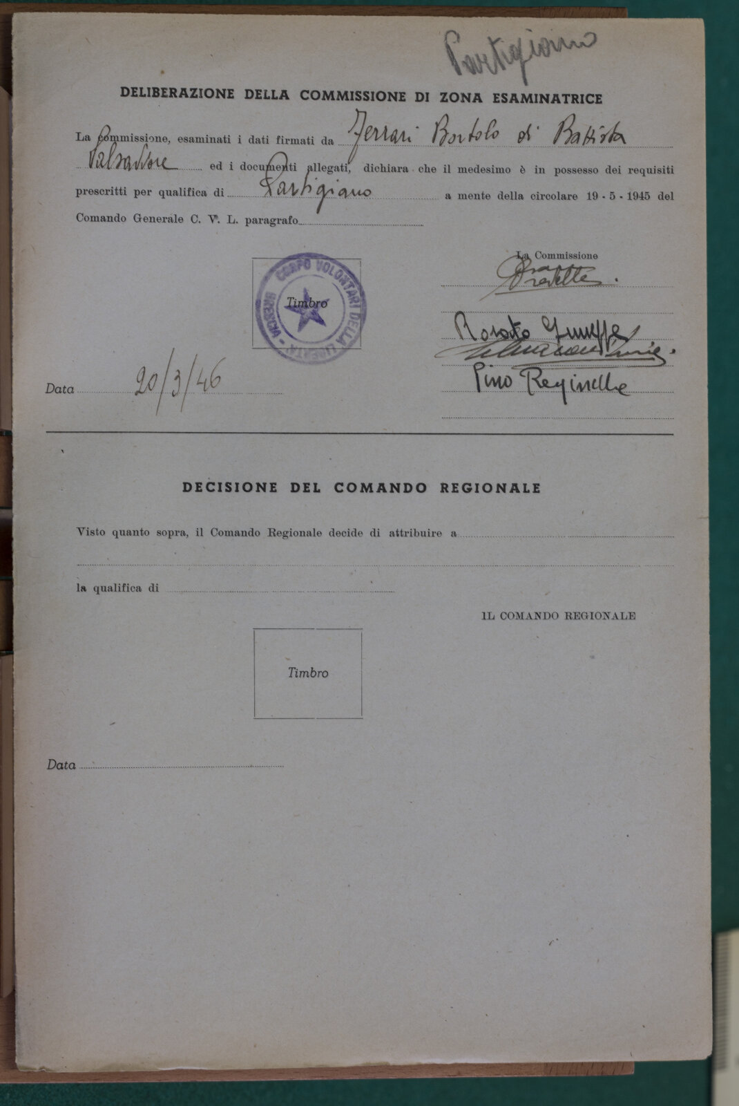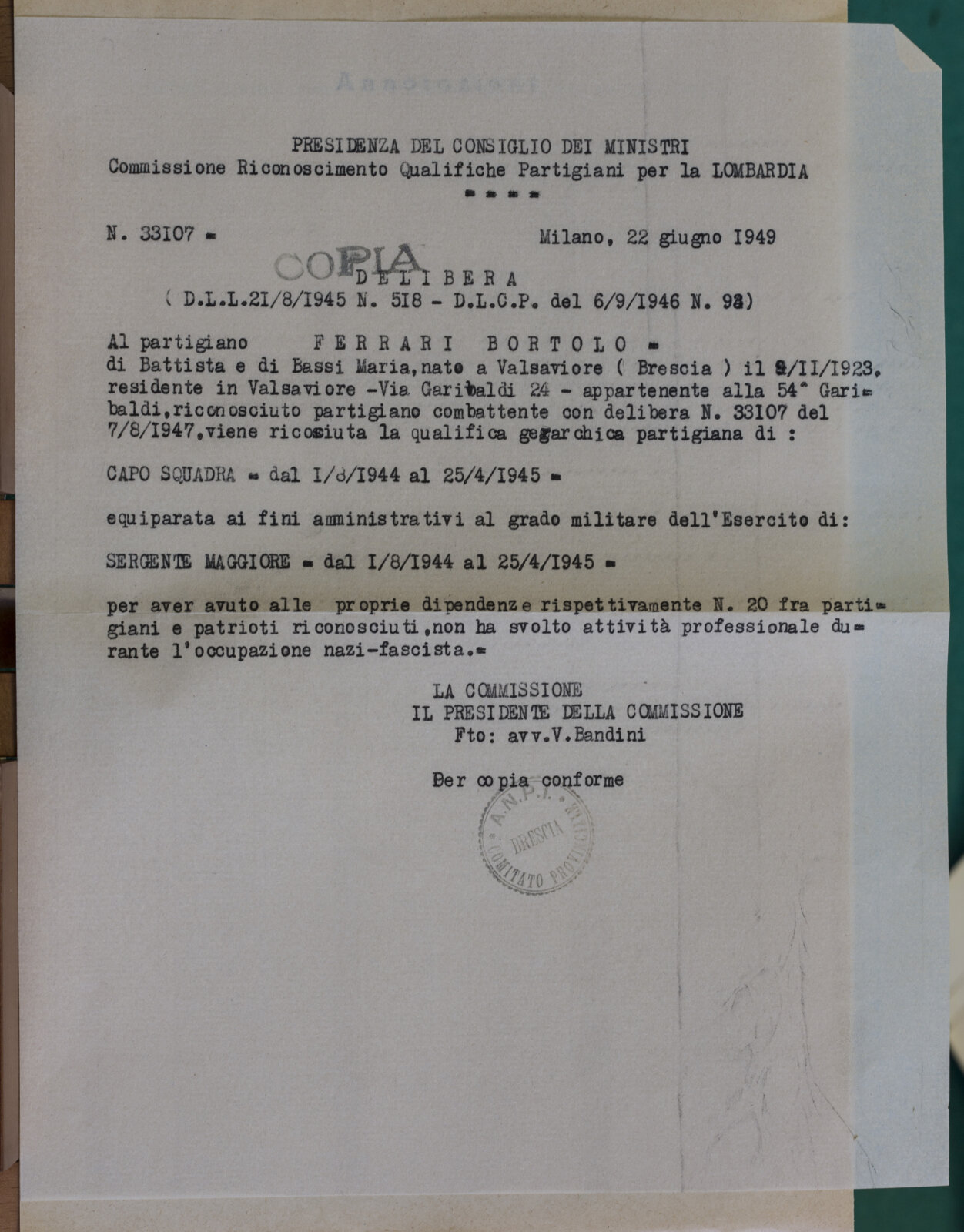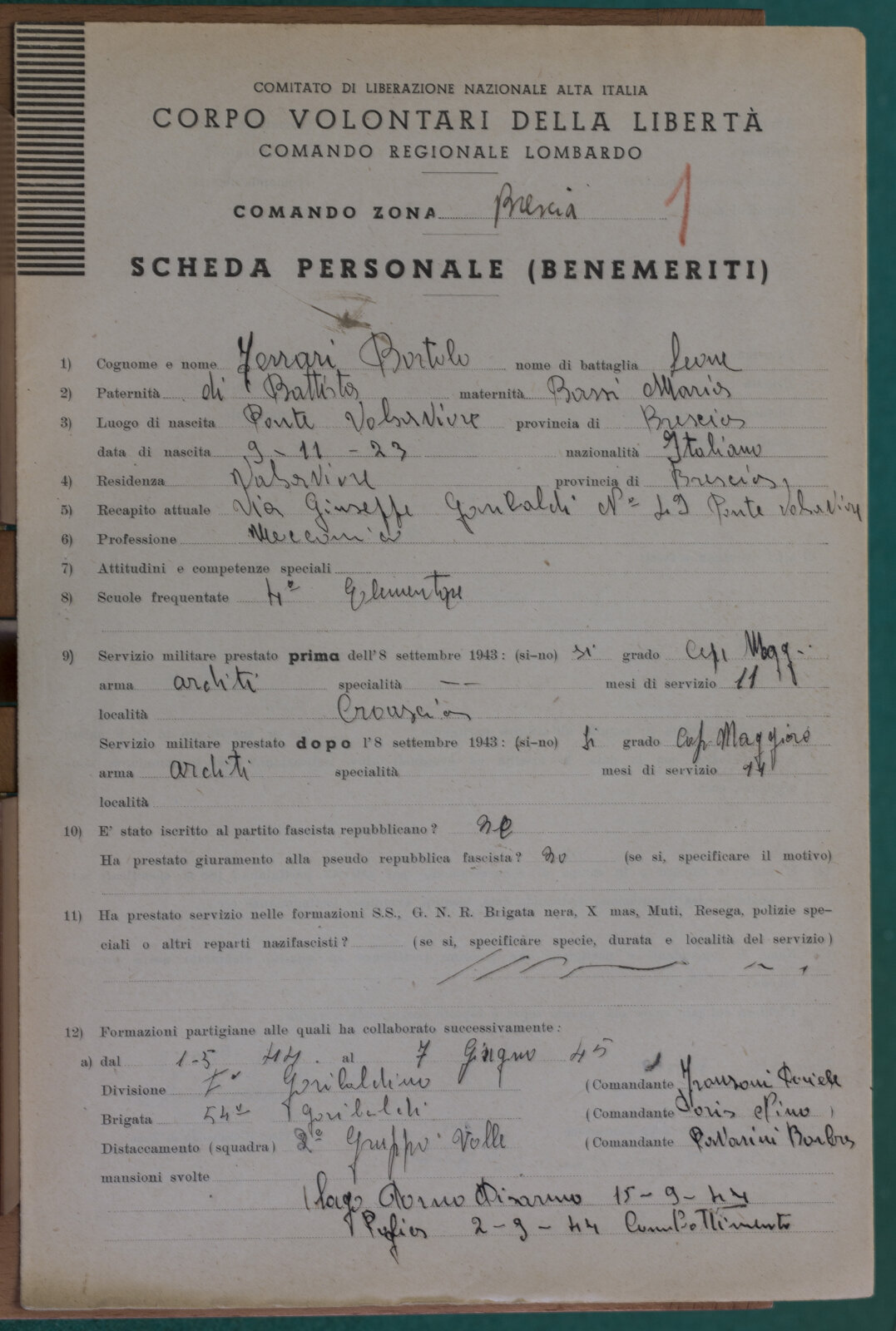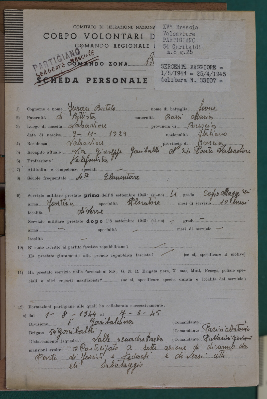 FERRARI BORTOLO (07-07-1909) - Partigiano e Tenente Maggiore
