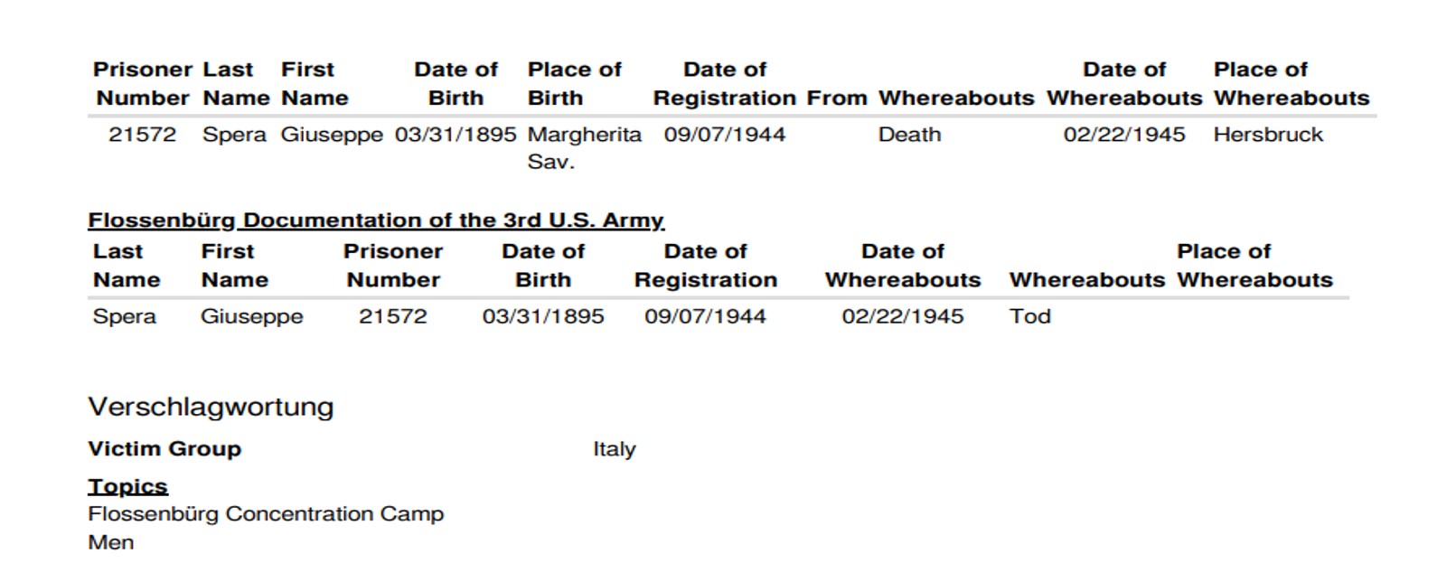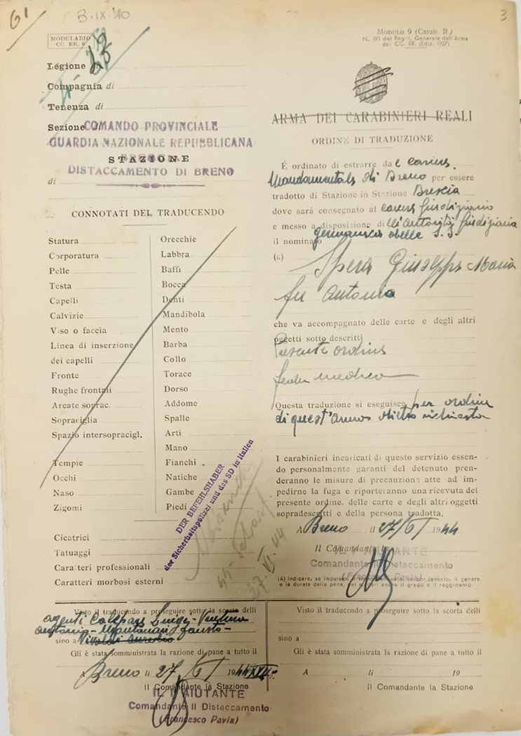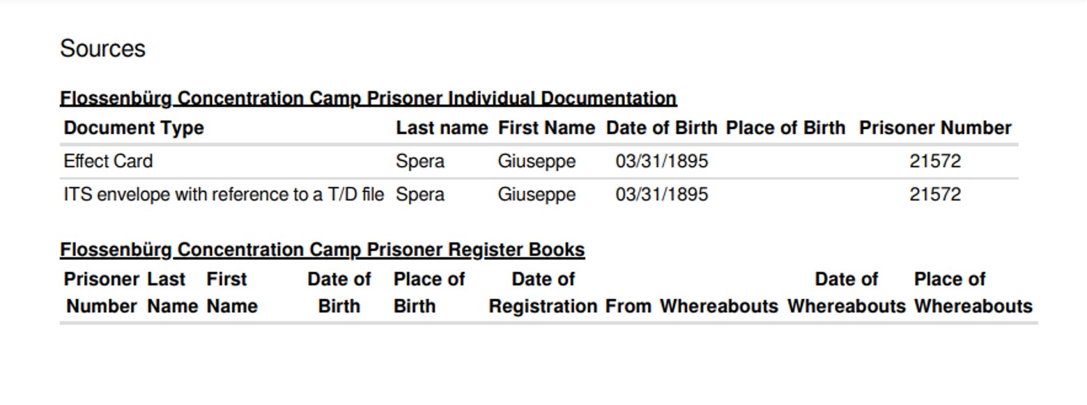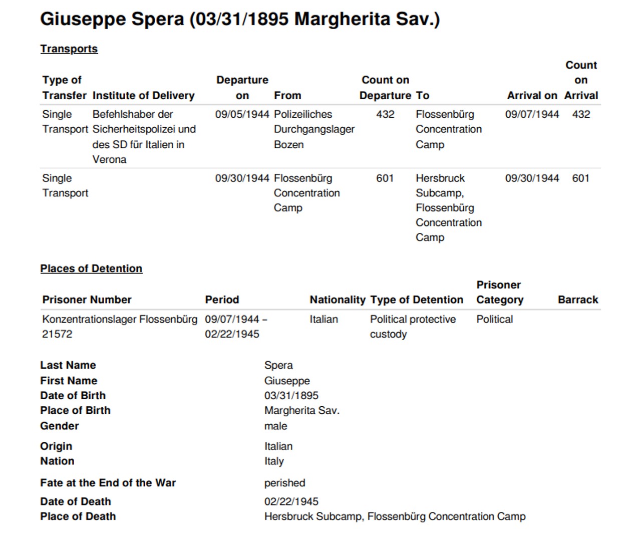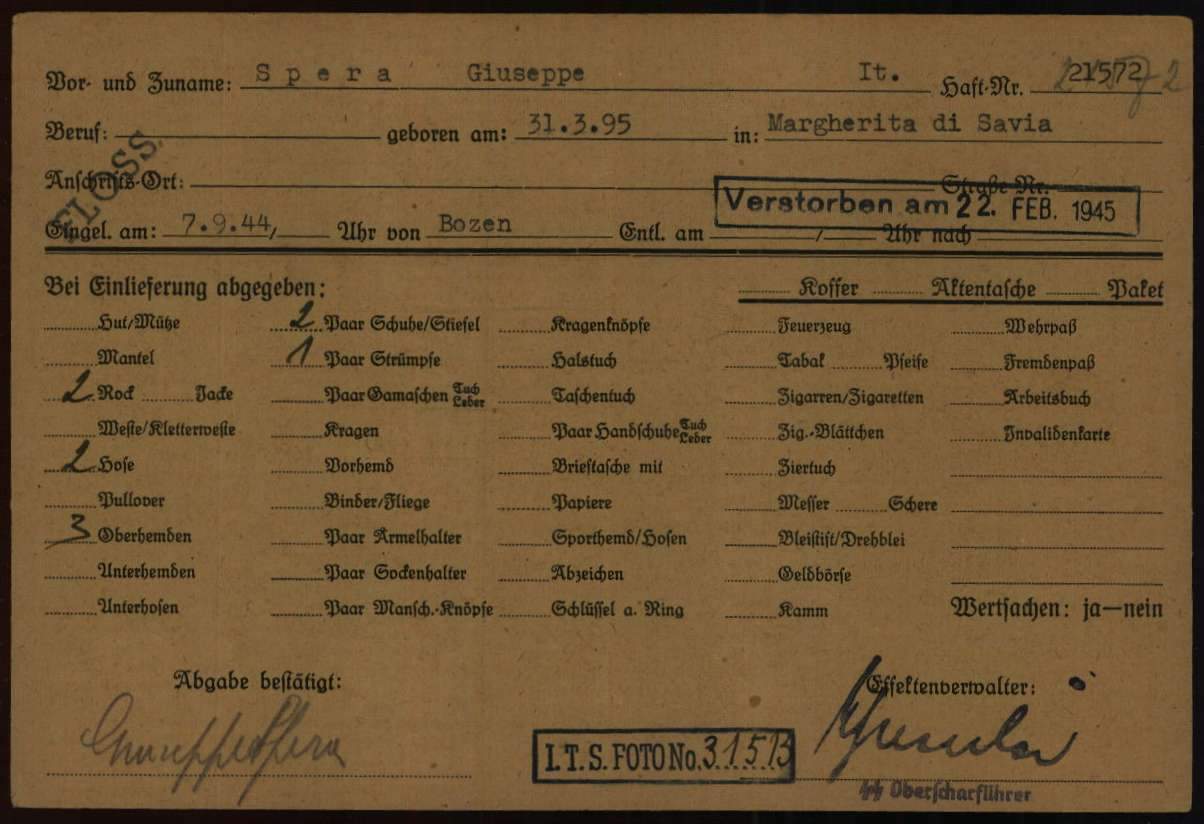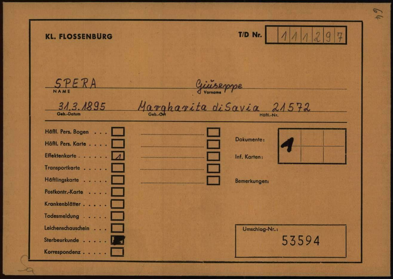 Nato il 31 marzo 1895 a Margherita di Savoia, in provincia di Foggia, era residente a Cedegolo, in località “Baste”, e in paese gestiva l’osteria “NOVECENTO”, l’attuale “Bar Baraonda”. Era figlio di Antonio e Francesca Lopez. Sposò Maria Boldini di Saviore, con la quale ebbe due figli: Andrea, nato nel 1933, e Stefania, nata nel 1938. La moglie era cugina di Gino Boldini, una figura importante considerata “la memoria storica della Resistenza in Valsaviore”: Gino da carabiniere divenne infatti responsabile di polizia del gruppo di partigiani della 54ª Brigata Garibaldi che, con l’appoggio dei cittadini e delle famiglie di Cevo e Saviore, contribuì in modo fondamentale alla liberazione del territorio dall’occupazione nazifascista. Giuseppe Spera aveva la passione del disegno, in particolare delle caricature, che siglava con “GS” e la data di esecuzione. Fu arrestato a Cedegolo il 19 giugno 1944 nel corso di un rastrellamento da parte di un gruppo di falsi partigiani appartenenti alla “Banda Marta”, un reparto di polizia speciale diretto dai tedeschi e legato alla brigata nera “Ettore Muti”. Si trattava di ex detenuti liberati dalle carceri con lo scopo di stanare i partigiani dai loro nascondigli e catturarli. Giuseppe fu condotto nel carcere di Cevo e poi in quello di Breno. Da quest’ultimo mandò una lettera alla moglie in cui emergono la sua forza d’animo e i metodi brutali utilizzati dai nazifascisti: “Venerdì sono stato nuovamente interrogato e torturato bestialmente. Pazienza! Ho subito ancora e spero sia stata l’ultima volta”. Il 27 giugno 1944 da Breno venne trasferito nel carcere di Canton Mombello di Brescia, da dove inviò altre lettere alla famiglia. In una di queste scrive alla moglie che non sta più ricevendo sue notizie, che lo conforterebbero molto. Poi indica a Maria di non inviargli più pacchi e lettere indirizzate a suo nome, ma a nome di un altro detenuto, meno controllato di lui. Chiede di poter ricevere cibo, soldi, dolci, formaggella, caramelle e un po’ di cioccolata, insieme a qualche sigaretta. Le scrive anche di inserire la sua lettera di risposta nel pacco insieme agli altri beni. Nel frattempo Giuseppe continua ad essere torturato, ma nonostante questo non svela mai informazioni sul movimento di Resistenza della Val Saviore, ragion per cui il 10 agosto 1944 è condotto a Bolzano, dove rimane due giorni. Il 5 settembre viene avviato al lager di Flossenburg con il trasporto n. 81 (il primo dei tre trasporti partiti da Bolzano) tramite la polizia di sicurezza di Verona (la Sicherheitspolizei). Giunto a destinazione il 7 Settembre, Giuseppe riceve il numero di matricola 21572 e viene classificato come “politisch” ossia deportato politico, il cui simbolo è un triangolo rosso rovesciato. Il 30 settembre è trasferito nel sotto campo di Hersbruck, dove muore il 22 febbraio 1945, per “causa non registrata” secondo alcuni documenti, per altri a causa di malattia. Quando la guerra si conclude, la famiglia invia telegrammi agli ospedali per chiedere informazioni nella speranza che Giuseppe sia sopravvissuto al campo di concentramento, ma non ottiene risposta fino a quando i medici dell’ospedale Porta Marina di Merano confermano la presenza di un Giuseppe Spera. Sfortunatamente non si tratta del loro Giuseppe, ma di un caso di omonimia: la moglie Maria offre al giovane scampato alla prigionia il pacco di vestiti portati per il marito. Soltanto a maggio del 1946 arriva alla famiglia la notizia della sua morte. Viene dedicata una messa a suffragio, in memoria sua e di tutti i suoi sacrifici per difendere la sua terra e i valori di libertà e giustizia: “Egli è morto. Ma anche per Lui l’Italia oggi vive e risorge a vita nuova”, disse Mons. Vittorio Bonomelli nell’orazione ufficiale.