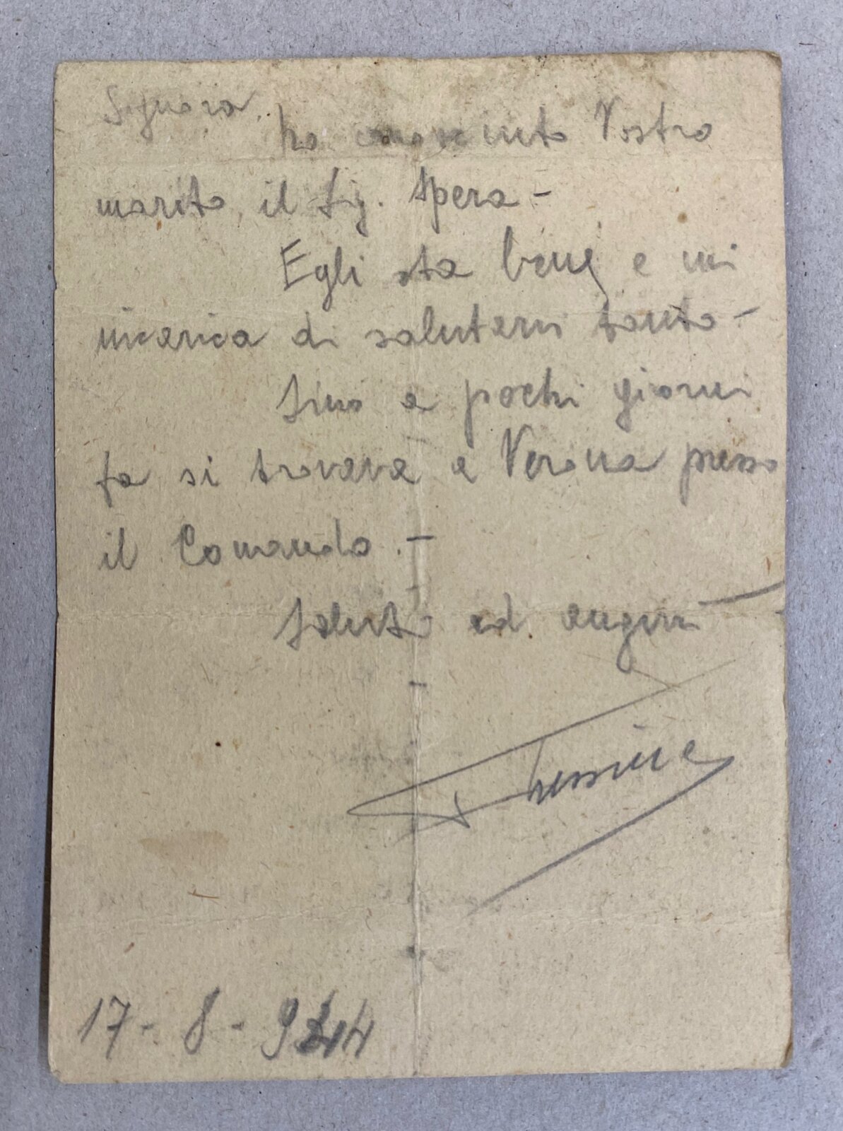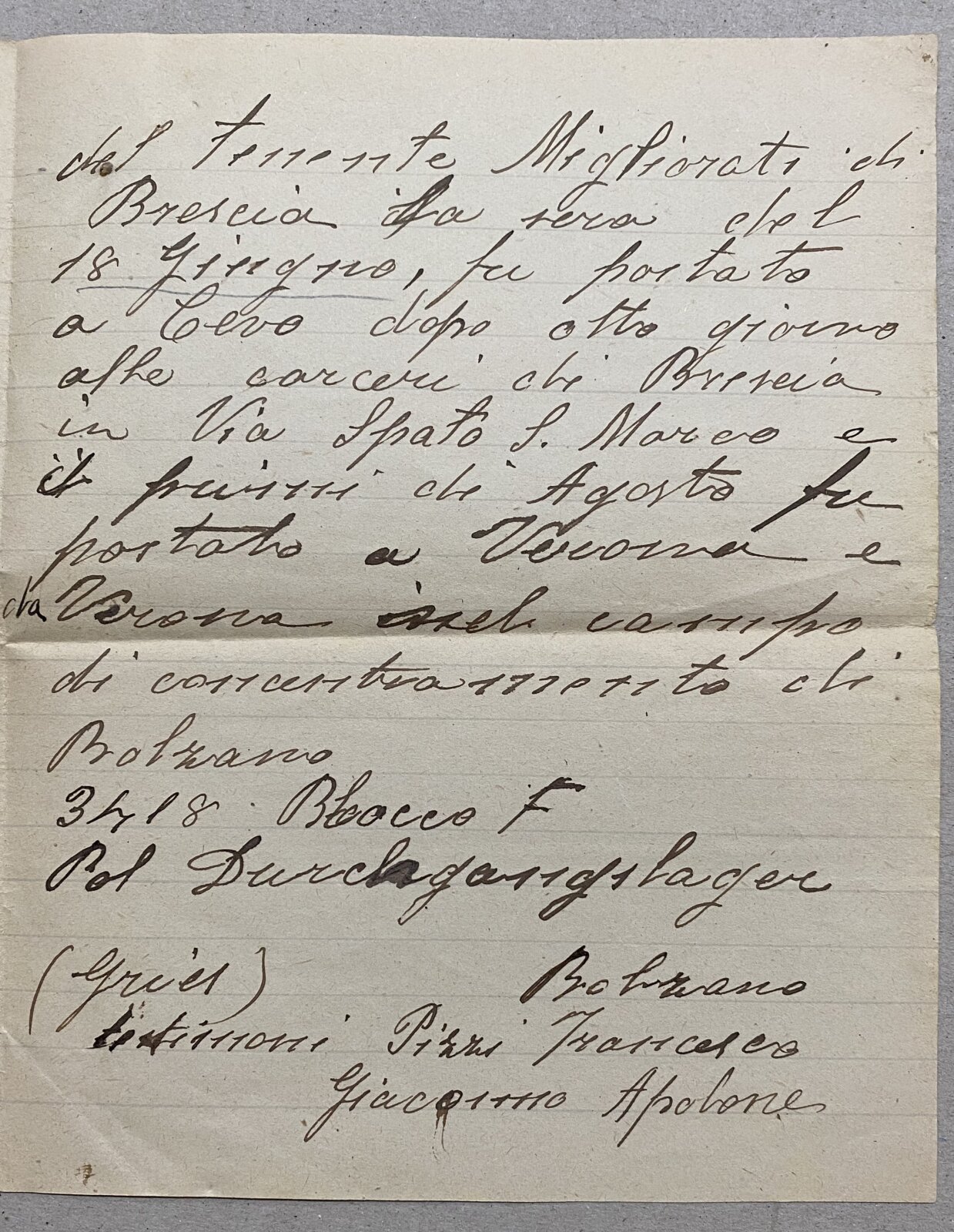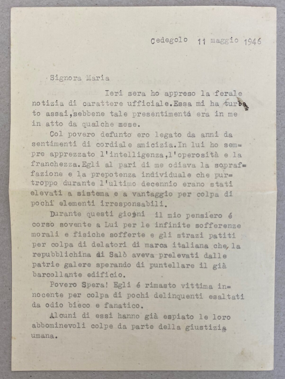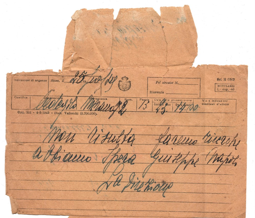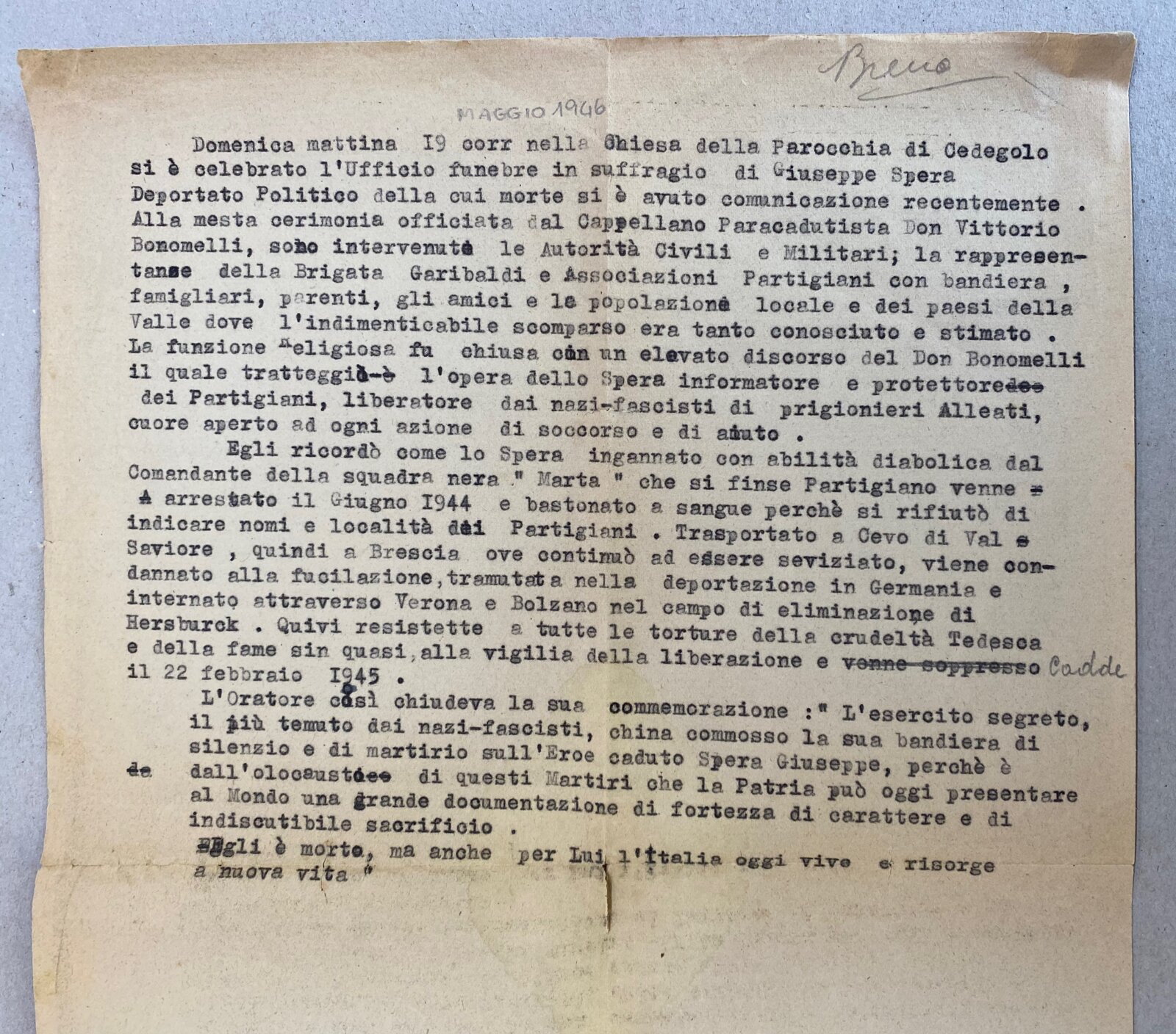 Nato il 31 marzo 1895 a Margherita di Savoia, in provincia di Foggia, era residente a Cedegolo, in località “Baste”, e in paese gestiva l’osteria “NOVECENTO”, l’attuale “Bar Baraonda”. Era figlio di Antonio e Francesca Lopez. Sposò Maria Boldini di Saviore, con la quale ebbe due figli: Andrea, nato nel 1933, e Stefania, nata nel 1938. La moglie era cugina di Gino Boldini, una figura importante considerata “la memoria storica della Resistenza in Valsaviore”: Gino da carabiniere divenne infatti responsabile di polizia del gruppo di partigiani della 54ª Brigata Garibaldi che, con l’appoggio dei cittadini e delle famiglie di Cevo e Saviore, contribuì in modo fondamentale alla liberazione del territorio dall’occupazione nazifascista. Giuseppe Spera aveva la passione del disegno, in particolare delle caricature, che siglava con “GS” e la data di esecuzione. Fu arrestato a Cedegolo il 19 giugno 1944 nel corso di un rastrellamento da parte di un gruppo di falsi partigiani appartenenti alla “Banda Marta”, un reparto di polizia speciale diretto dai tedeschi e legato alla brigata nera “Ettore Muti”. Si trattava di ex detenuti liberati dalle carceri con lo scopo di stanare i partigiani dai loro nascondigli e catturarli. Giuseppe fu condotto nel carcere di Cevo e poi in quello di Breno. Da quest’ultimo mandò una lettera alla moglie in cui emergono la sua forza d’animo e i metodi brutali utilizzati dai nazifascisti: “Venerdì sono stato nuovamente interrogato e torturato bestialmente. Pazienza! Ho subito ancora e spero sia stata l’ultima volta”. Il 27 giugno 1944 da Breno venne trasferito nel carcere di Canton Mombello di Brescia, da dove inviò altre lettere alla famiglia. In una di queste scrive alla moglie che non sta più ricevendo sue notizie, che lo conforterebbero molto. Poi indica a Maria di non inviargli più pacchi e lettere indirizzate a suo nome, ma a nome di un altro detenuto, meno controllato di lui. Chiede di poter ricevere cibo, soldi, dolci, formaggella, caramelle e un po’ di cioccolata, insieme a qualche sigaretta. Le scrive anche di inserire la sua lettera di risposta nel pacco insieme agli altri beni. Nel frattempo Giuseppe continua ad essere torturato, ma nonostante questo non svela mai informazioni sul movimento di Resistenza della Val Saviore, ragion per cui il 10 agosto 1944 è condotto a Bolzano, dove rimane due giorni. Il 5 settembre viene avviato al lager di Flossenburg con il trasporto n. 81 (il primo dei tre trasporti partiti da Bolzano) tramite la polizia di sicurezza di Verona (la Sicherheitspolizei). Giunto a destinazione il 7 Settembre, Giuseppe riceve il numero di matricola 21572 e viene classificato come “politisch” ossia deportato politico, il cui simbolo è un triangolo rosso rovesciato. Il 30 settembre è trasferito nel sotto campo di Hersbruck, dove muore il 22 febbraio 1945, per “causa non registrata” secondo alcuni documenti, per altri a causa di malattia. Quando la guerra si conclude, la famiglia invia telegrammi agli ospedali per chiedere informazioni nella speranza che Giuseppe sia sopravvissuto al campo di concentramento, ma non ottiene risposta fino a quando i medici dell’ospedale Porta Marina di Merano confermano la presenza di un Giuseppe Spera. Sfortunatamente non si tratta del loro Giuseppe, ma di un caso di omonimia: la moglie Maria offre al giovane scampato alla prigionia il pacco di vestiti portati per il marito. Soltanto a maggio del 1946 arriva alla famiglia la notizia della sua morte. Viene dedicata una messa a suffragio, in memoria sua e di tutti i suoi sacrifici per difendere la sua terra e i valori di libertà e giustizia: “Egli è morto. Ma anche per Lui l’Italia oggi vive e risorge a vita nuova”, disse Mons. Vittorio Bonomelli nell’orazione ufficiale.