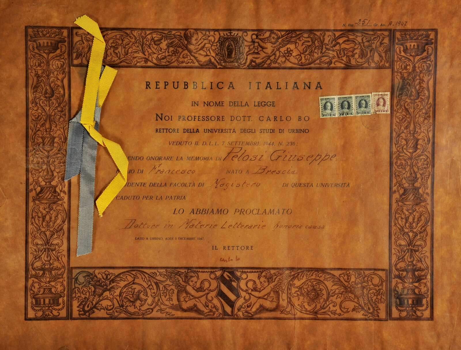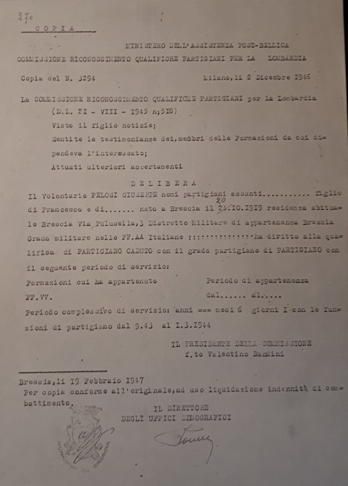 Giuseppe (Peppino) Pelosi, sottotenente del 24° reggimento fanteria “Como” dislocato in Croazia, fu fucilato dai tedeschi il 1° marzo a S. Michele di Verona, all’età di ventiquattro anni.