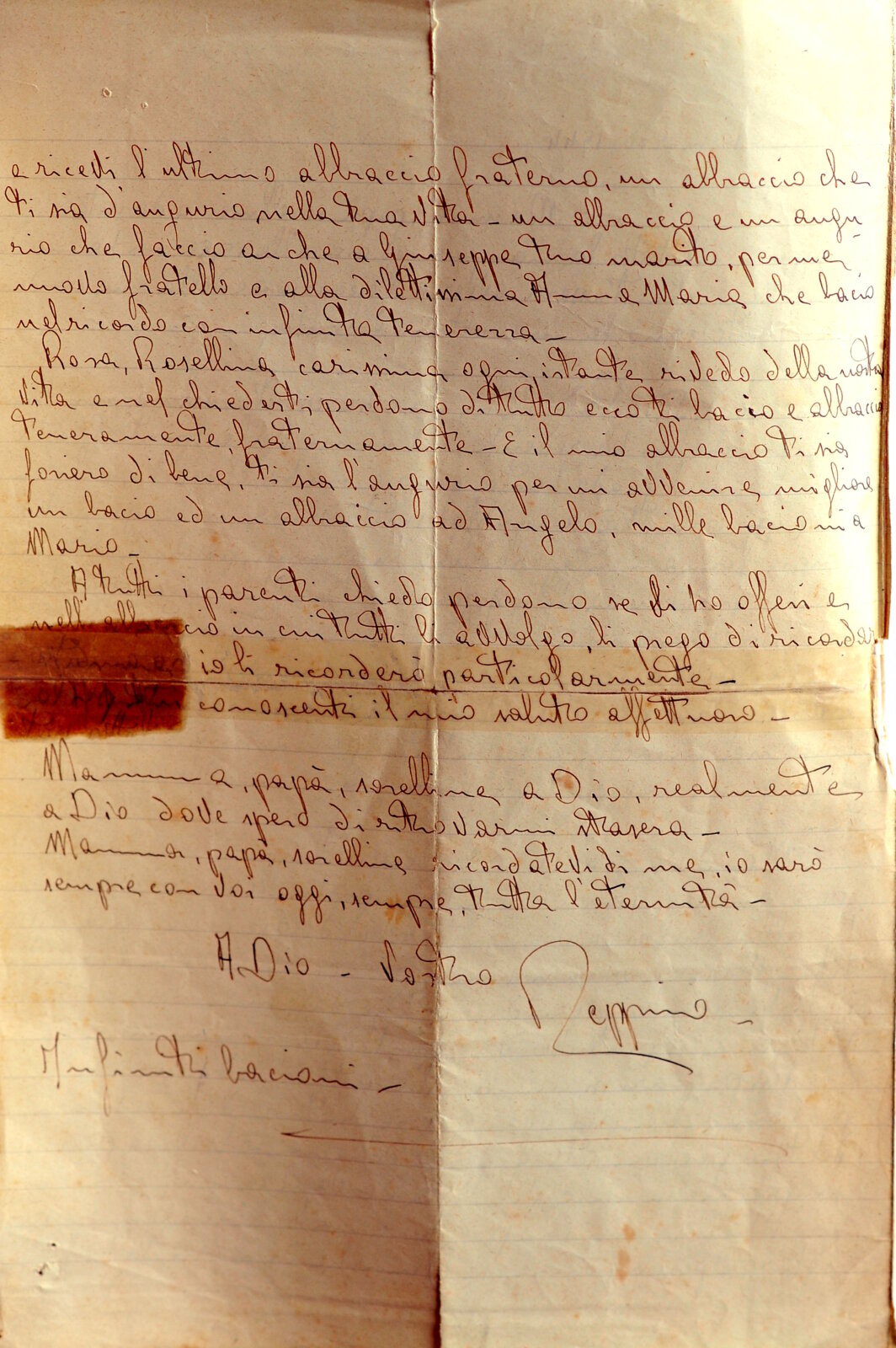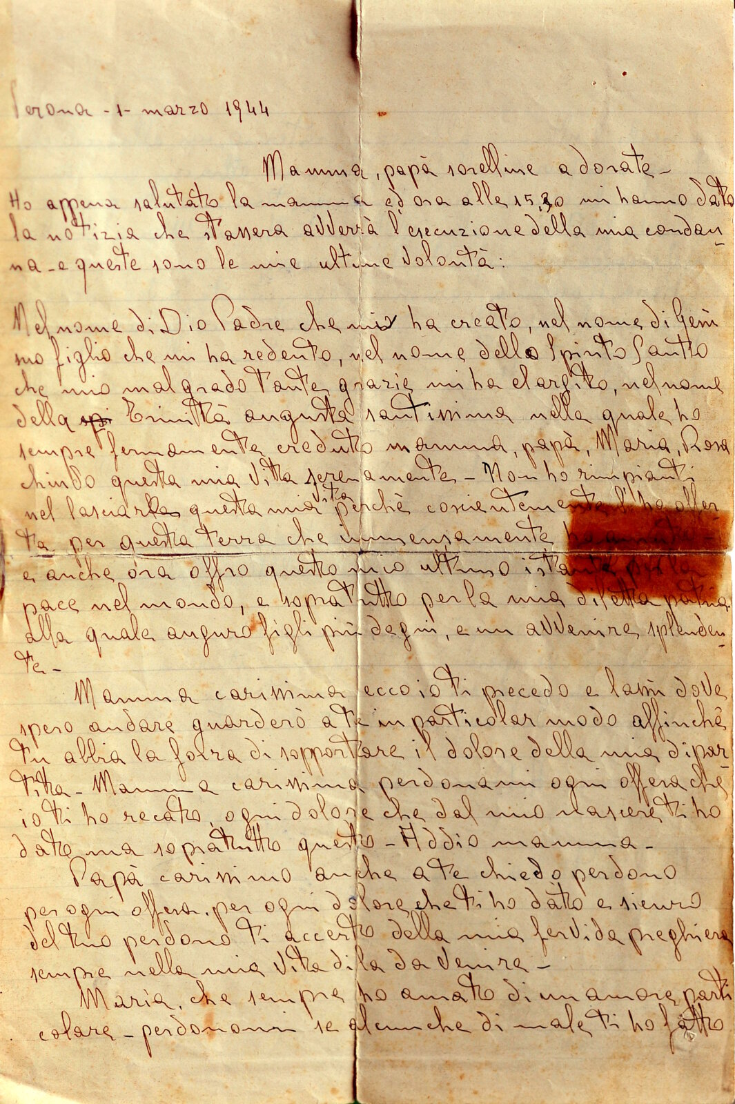 Poche ore prima dell’esecuzione della sentenza, la madre ebbe la grazia di vederlo in un incontro breve, durato solo pochi minuti, dopo di che chiese di poter scrivere le sue ultime parole, quelle in cui il distacco si fa luce per l’eternità: «Non ho rimpianti nel lasciare questa mia vita perché coscientemente l’ho offerta per questa terra che immensamente ho amato, e anche ora offro questo mio ultimo istante per la pace nel mondo e soprattutto per la mia diletta patria alla quale auguro figli più degni e un avvenire più splendente…»