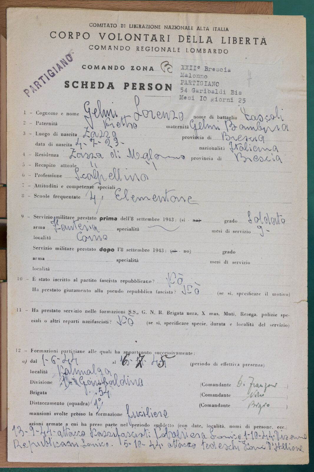 Dopo la scuola si andava per legna e per «patüs» (foglie secche) nel bosco, poi ad aiutare nei campi, soprattutto se si aveva molta campagna, così da scambiare quello che si coltivava con altri generi alimentari, per poter mangiare o poter guadagnare del denaro. Avevo 14 anni quando ho cominciato ad andare a Cevo dal sarto Angelo Bazzana ad imparare il mestiere: ci andavo tutti i giorni a piedi, andata e ritorno, indossando degli zoccoli di legno e questo accadde per tre anni. Eravamo in tempo di guerra, partivo e rientravo sempre al buio e, oltre alla fatica del percorso, avevo molta paura perché ero una ragazza giovane e sola e sulla strada incontravo tanta gente. Poi dal 1943 hanno iniziato ad esserci i partigiani e per questo i tedeschi e i fascisti venivano spesso a fare i rastrellamenti in paese per cercarli e così la gente, quando loro arrivavano, si andava a nascondere per la paura perché facevano disastri e facevano «tribulare» …