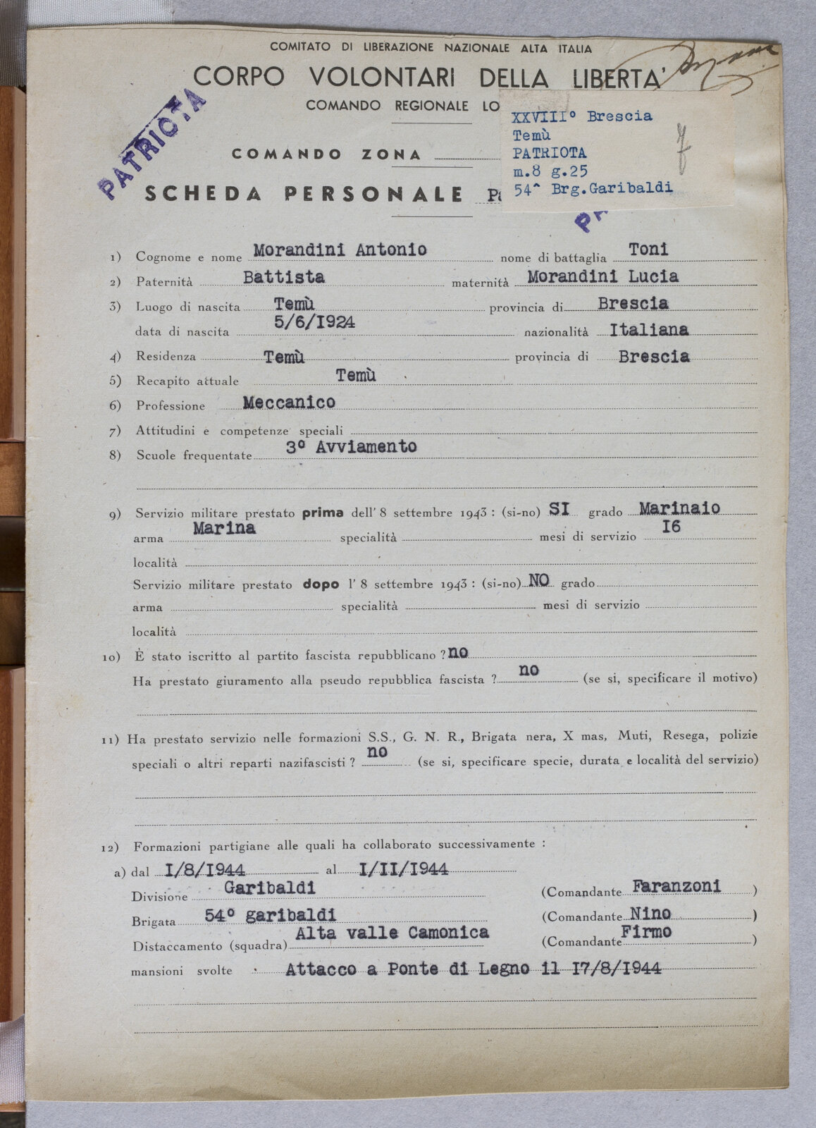 MORANDINI ANTONIO - Patriota