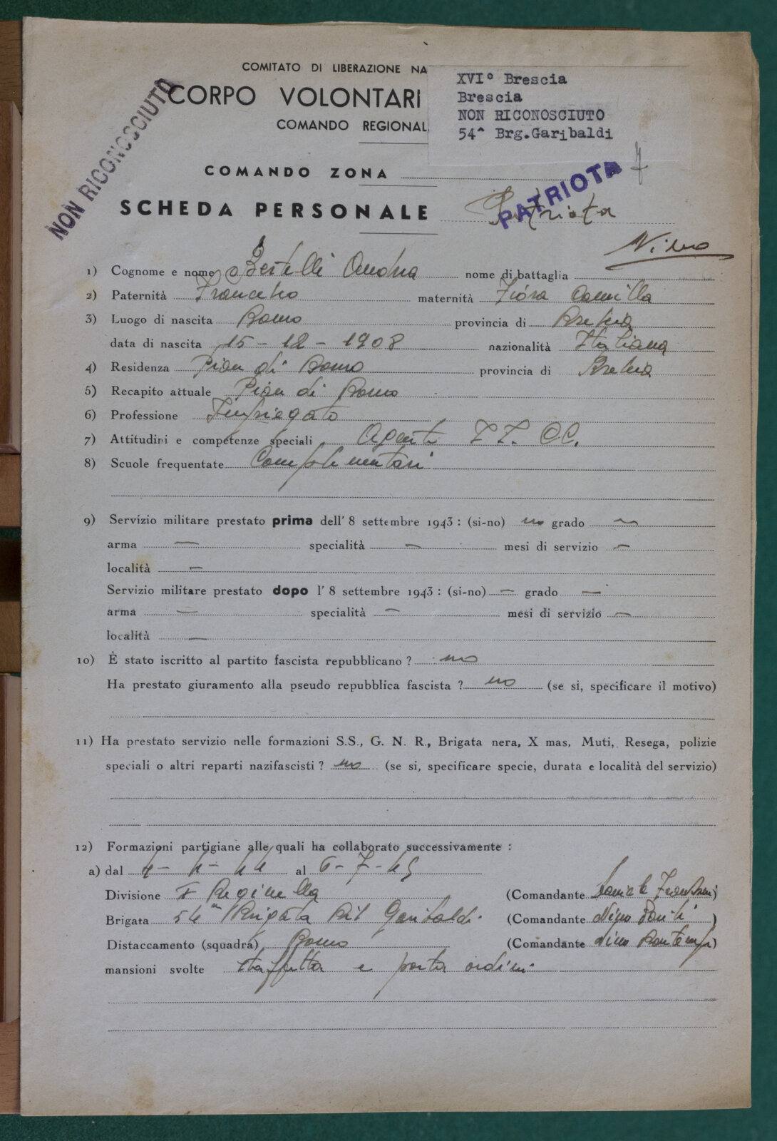 SCOLARI GAETANO - Partigiano non riconosciuto