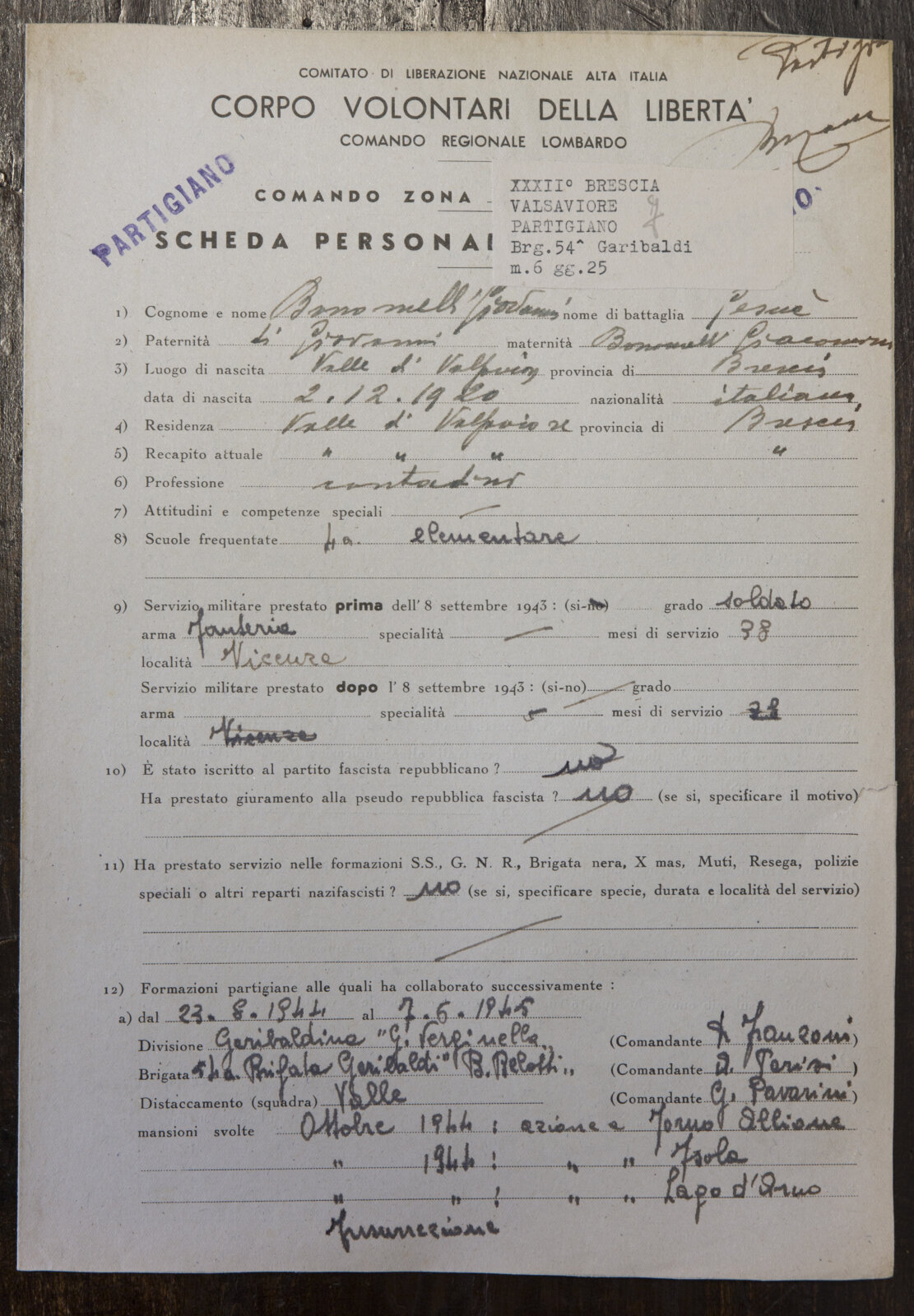 BONOMELLI GIOVANNI (02-12-1920) - Partigiano