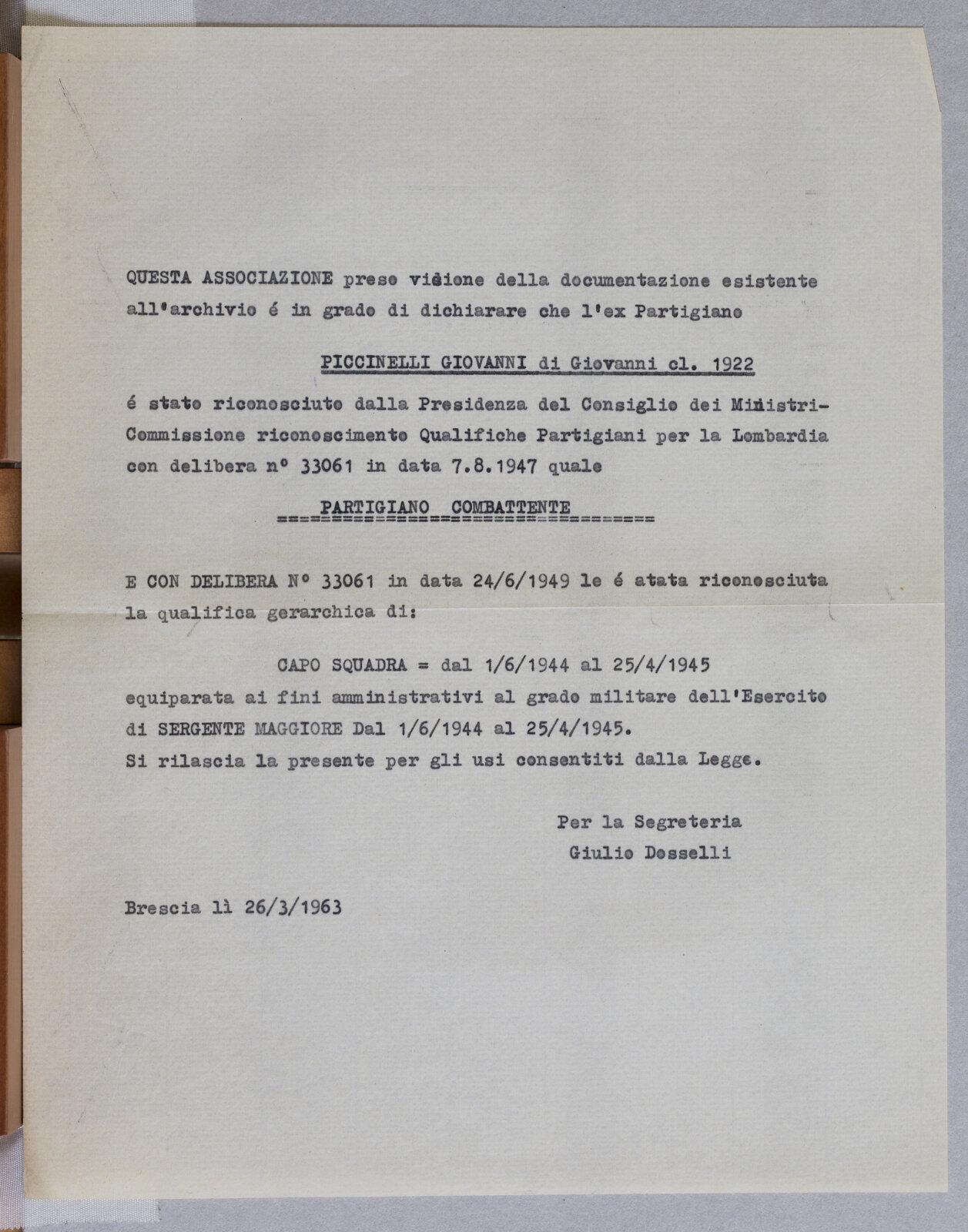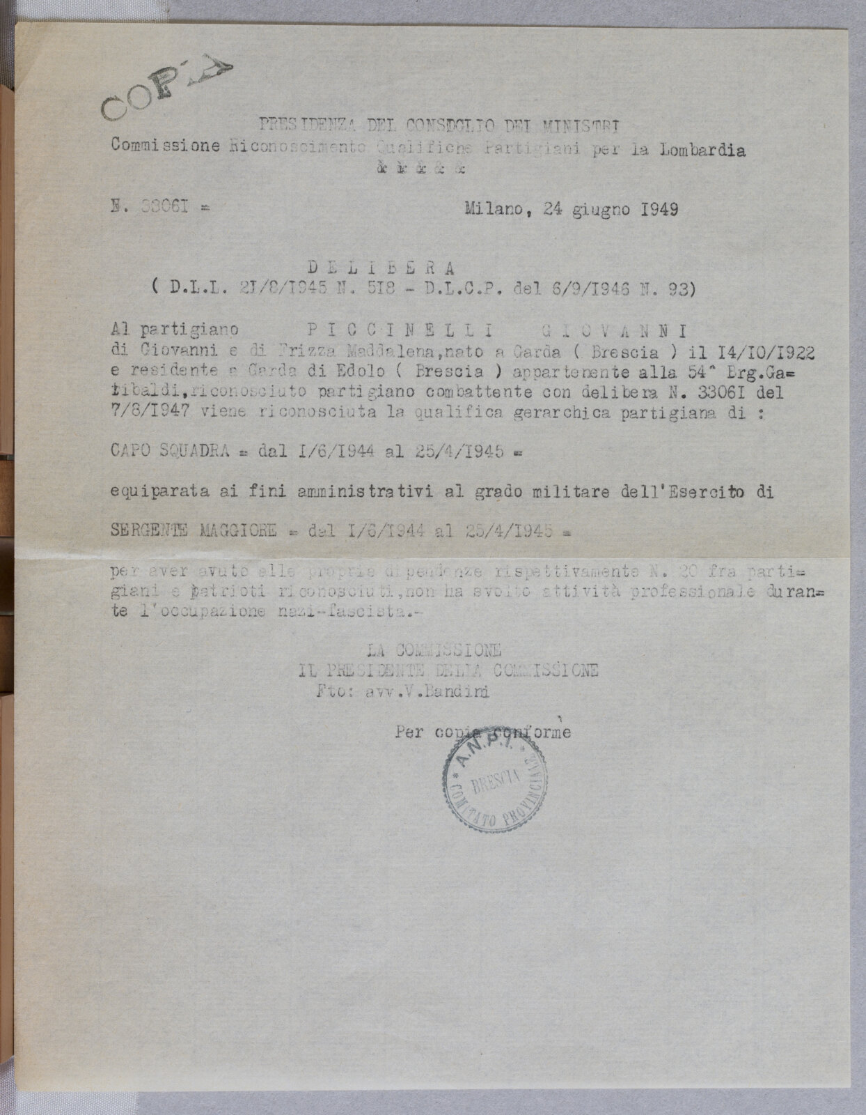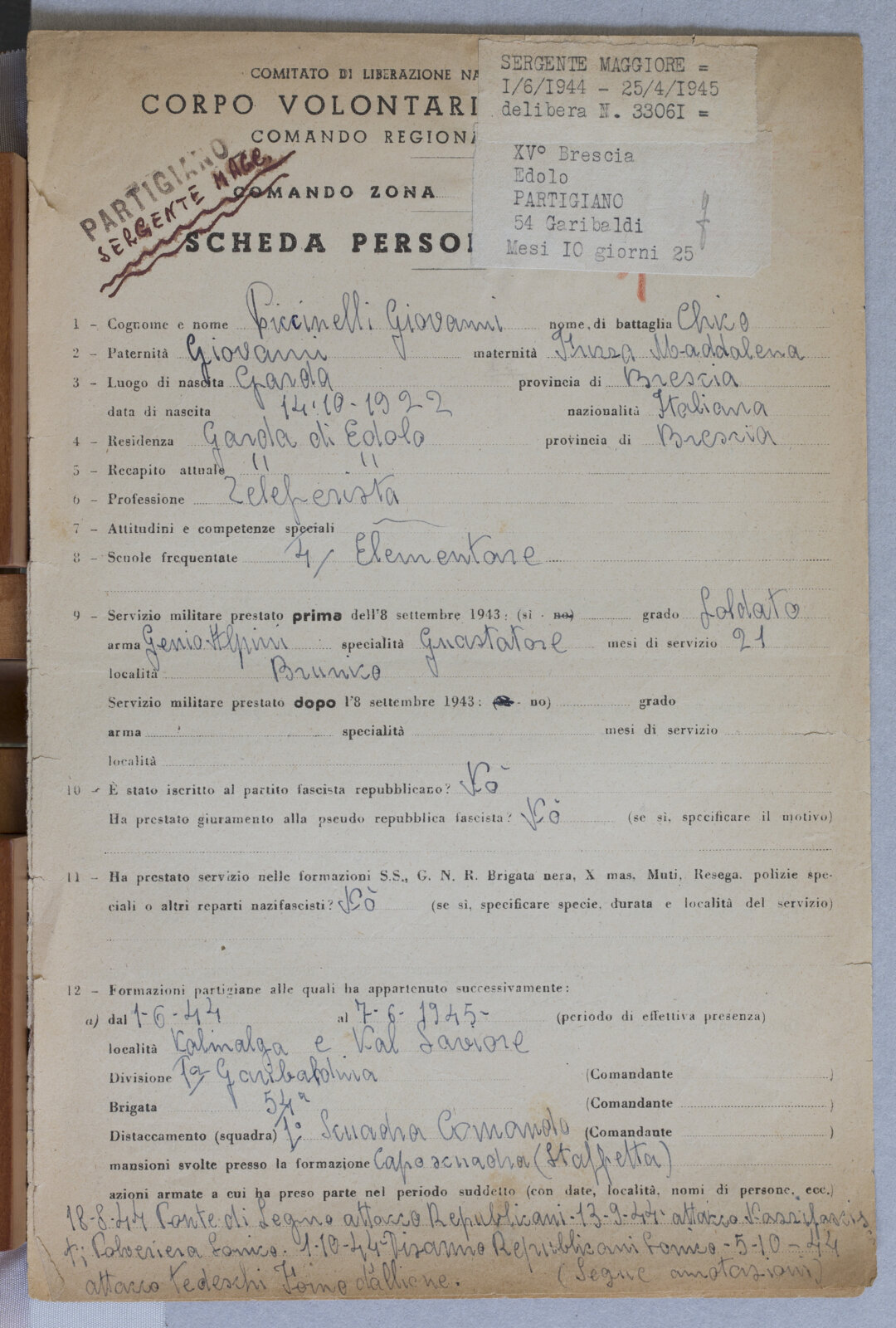 PICCINELI GIOVANNI - Partigiano e Sergente Maggiore