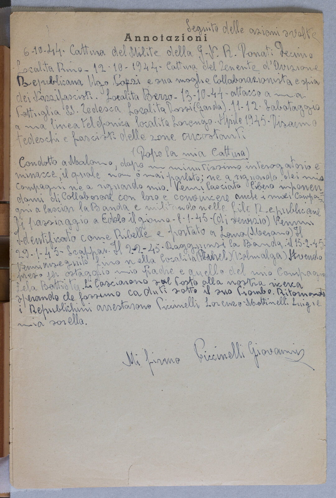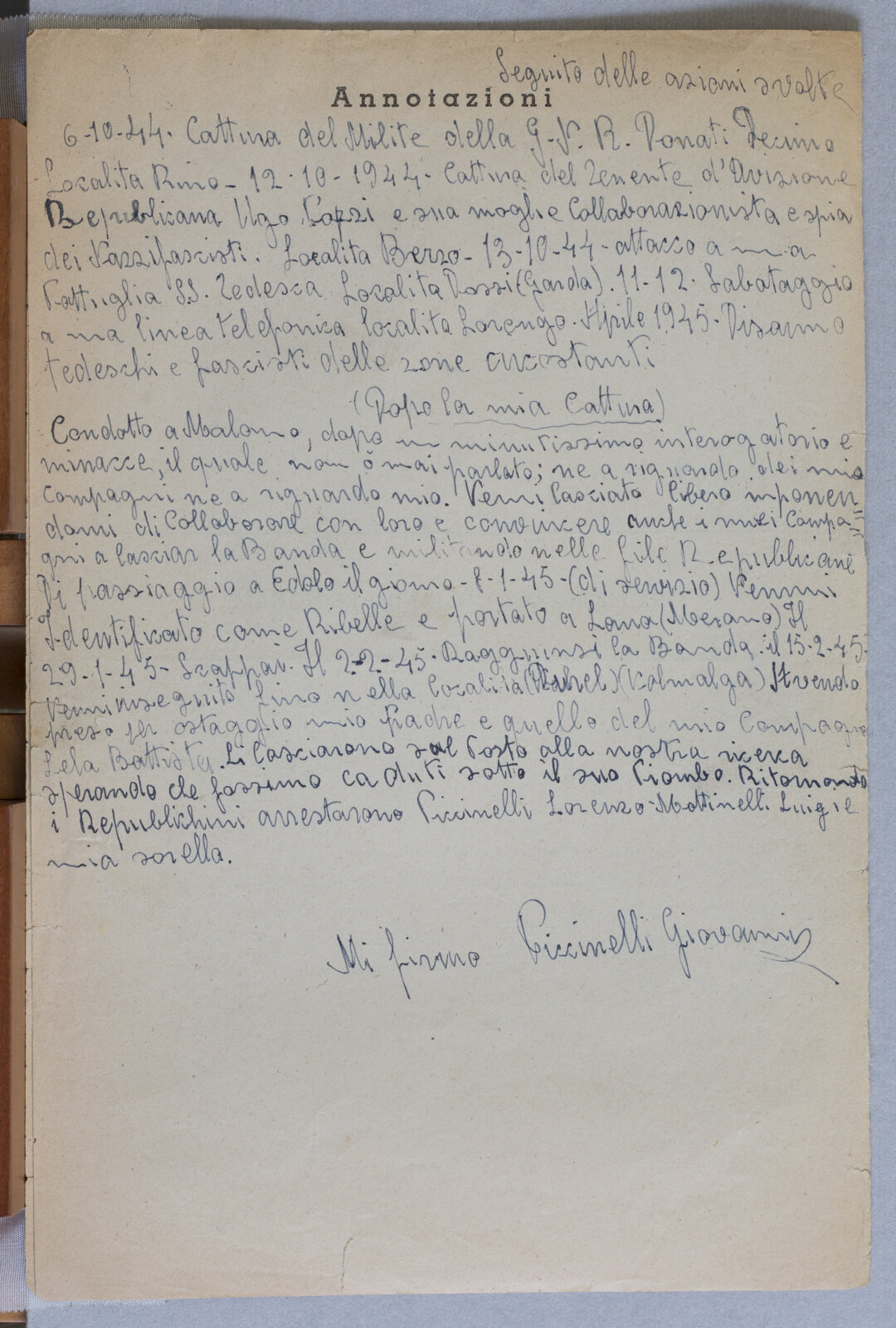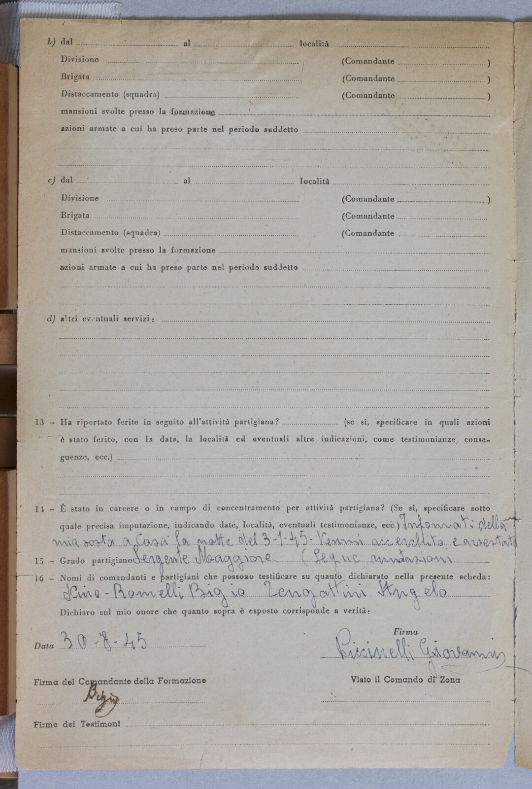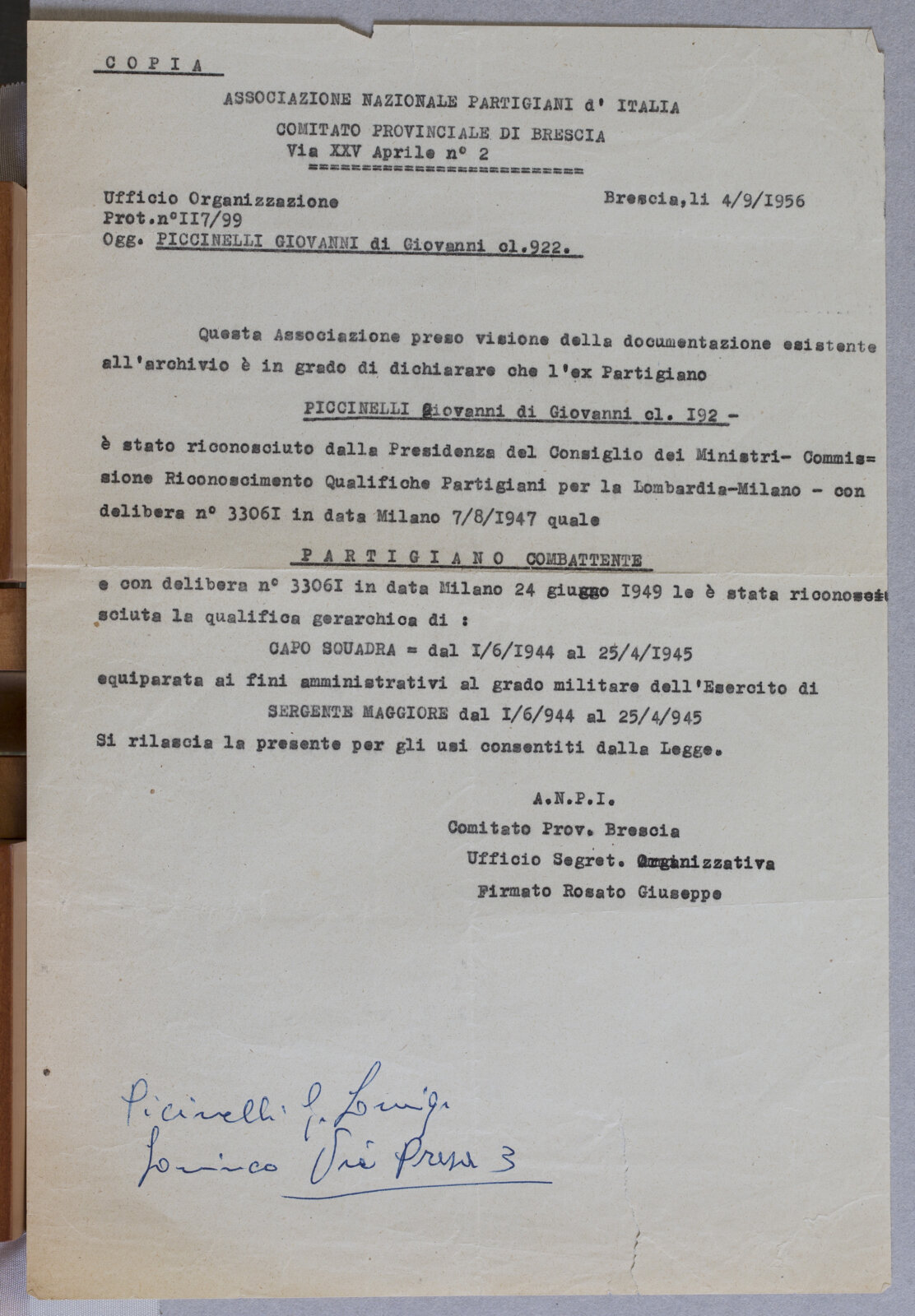 PICCINELI GIOVANNI - Partigiano e Sergente Maggiore