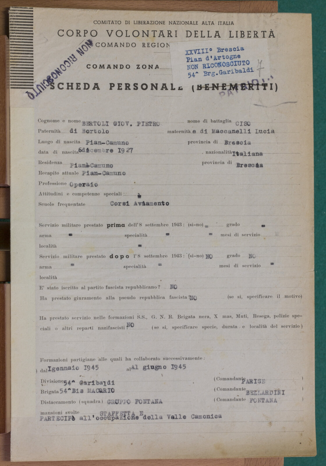 BERTOLI GIOVAN PIETRO - Partigiano non riconosciuto