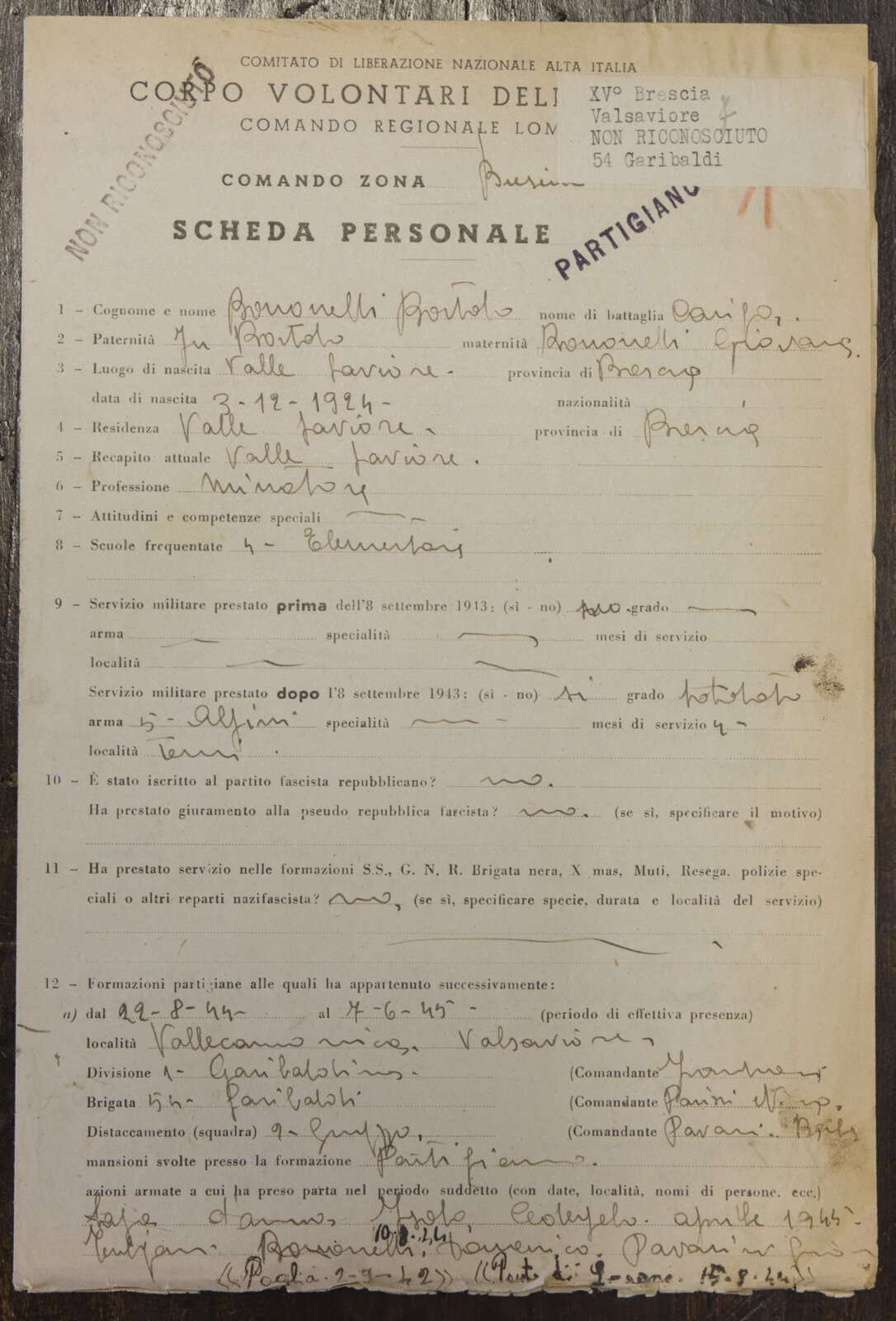 BONOMELLI BORTOLO (03-12-1924) - Partigiano non riconosciuto